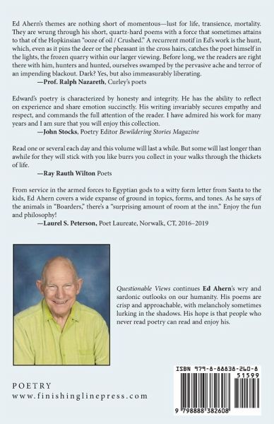 Questionable Views continues Ed Ahern's wry and sardonic outlooks on our humanity. His poems are crisp and approachable, with melancholy sometimes lurking in the shadows. His hope is that people who never read poetry can read and enjoy his.