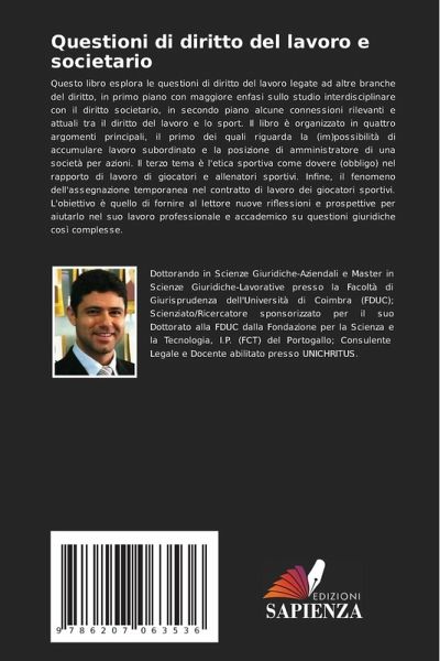 Questo libro esplora le questioni di diritto del lavoro legate ad altre branche del diritto, in primo piano con maggiore enfasi sullo studio interdisciplinare con il diritto societario, in secondo piano alcune connessioni rilevanti e attuali tra il diritto del lavoro e lo sport. Il libro è organizzato in quattro argomenti principali, il primo dei quali riguarda la (im)possibilità di accumulare lavoro subordinato e la posizione di amministratore di una società per azioni. Il terzo tema è l'etica sportiva come dovere (obbligo) nel rapporto di lavoro di giocatori e allenatori sportivi. Infine, il fenomeno dell'assegnazione temporanea nel contratto di lavoro dei giocatori sportivi. L'obiettivo è quello di fornire al lettore nuove riflessioni e prospettive per aiutarlo nel suo lavoro professionale e accademico su questioni giuridiche così complesse.