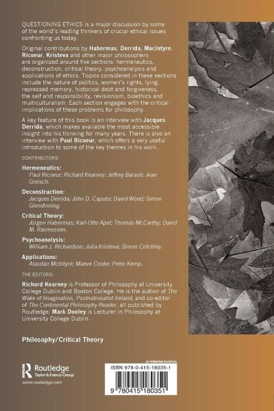 This major discussion takes a look at some of the most important ethical issues confronting us today by some of the worlda (TM)s leading thinkers. Including essays from leading thinkers, such as Jurgen Habermas, Alasdair MacIntyre, Julia Kristeva and Paul Ricoeur, the booka (TM)s highlight a " an interview with Jacques Derrida - presents the most accessible insight into his thinking on ethics and politics for many years. Exploring topics ranging from history, memory, revisionism, and the self and responsibility to democracy, multiculturalism, feminism and the future of politics, the essays are grouped into five thematic sections: * hermeneutics * deconstruction * critical theory * psychoanalysis * applied ethics. Each section considers the challenges posed by ethics and how critical thinking has transformed philosophy today. Questioning Ethics affords an unsurpassed overview of the state of ethical thinking today by some of the worlda (TM)s foremost philosophers.