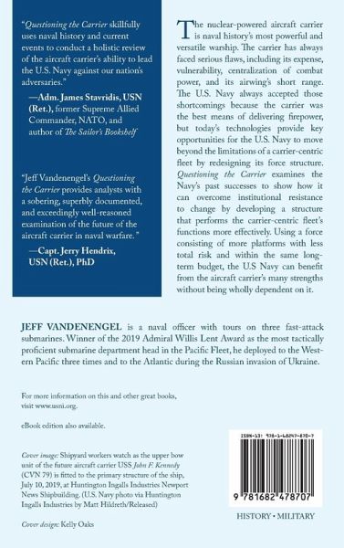Winner of The Navy League's 2024 Alfred Thayer Mahan Award for Literary Achievement. The nuclear-powered aircraft carrier is naval history’s most powerful and versatile warship. It is the reason the U.S. Navy is the predominant force at sea today. Throughout its illustrious history, the carrier has overcome serious flaws, including its expense, vulnerability, centralization of combat power, and its airwing’s short range. The U.S. Navy always accepted those flaws because the carrier was the best means of delivering firepower. Today’s technologies, however, provide key opportunities for the U.S. Navy to move beyond the limitations of a carrier-centric fleet by redesigning its force structure. Questioning the Carrier examines how the U.S. Navy can embrace the Age of the Missile, network the distributed fleet, and diversify to develop a fleet that benefits from the aircraft carrier’s many strengths without being wholly dependent on them. By acting on those opportunities, the U.S. Navy can develop a structure that performs the carrier-centric fleet’s functions more effectively using a force consisting of more platforms with less total risk and within the same long-term budget. As adversaries are improving their ability to deter the carrier thus causing its utility to wane, the author examines the Navy’s past successes to show how it can overcome institutional resistance to change and continue to rule the seas.