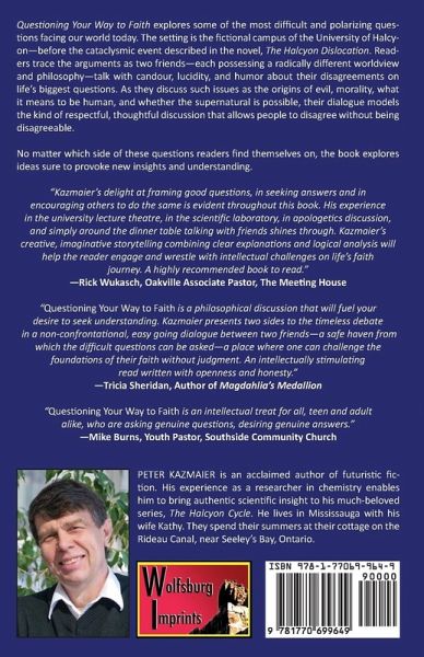 Questioning Your Way to Faith explores some of the most difficult and polarizing questions facing our world today. The setting is the fictional campus of the University of Halcyon-before the cataclysmic event described in the novel, The Halcyon Dislocation. Readers trace the arguments as two friends-each possessing a radically different worldview and philosophy-talk with candour, lucidity, and humor about their disagreements on life's biggest questions. As they discuss such issues as the origins of evil, morality, what it means to be human, and whether the supernatural is possible, their dialogue models the kind of respectful, thoughtful discussion that allows people to disagree without being disagreeable. No matter which side of these questions readers find themselves on, the book explores ideas sure to provoke new insights and understanding. About the Author: Peter Kazmaier is an acclaimed author of futuristic fiction. His experience as a researcher in chemistry enables him to bring authentic scientific insight to his much-beloved series, The Halcyon Cycle. He lives with his wife Kathy in Mississauga. They spend their summers at their cottage on the Rideau Canal, near Seeley's Bay, Ontario.