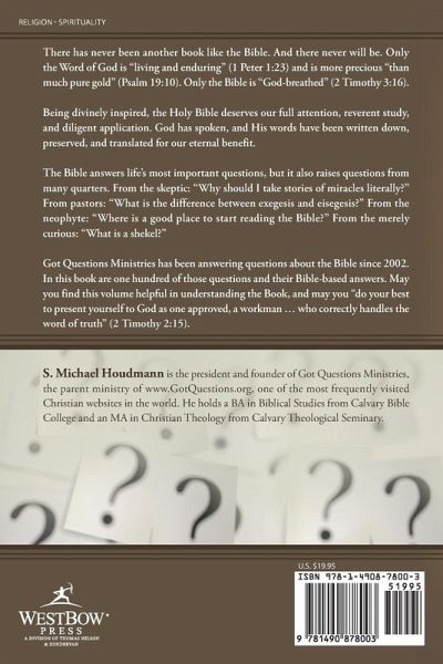 There has never been another book like the Bible. And there never will be. Only the Word of God is "living and enduring" (1 Peter 1:23) and is more precious "than much pure gold" (Psalm 19:10). Only the Bible is "God-breathed" (2 Timothy 3:16). Being divinely inspired, the Holy Bible deserves our full attention, reverent study, and diligent application. God has spoken, and His words have been written down, preserved, and translated for our eternal benefit. The Bible answers life's most important questions, but it also raises questions from many quarters. From the skeptic: "Why should I take stories of miracles literally?" From pastors: "What is the difference between exegesis and eisegesis?" From the neophyte: "Where is a good place to start reading the Bible?" From the merely curious: "What is a shekel?" Got Questions Ministries has been answering questions about the Bible since 2002. In this book are one hundred of those questions and their Bible-based answers. May you find this volume helpful in understanding the Book, and may you "do your best to present yourself to God as one approved, a workman ... who correctly handles the word of truth" (2 Timothy 2:15).