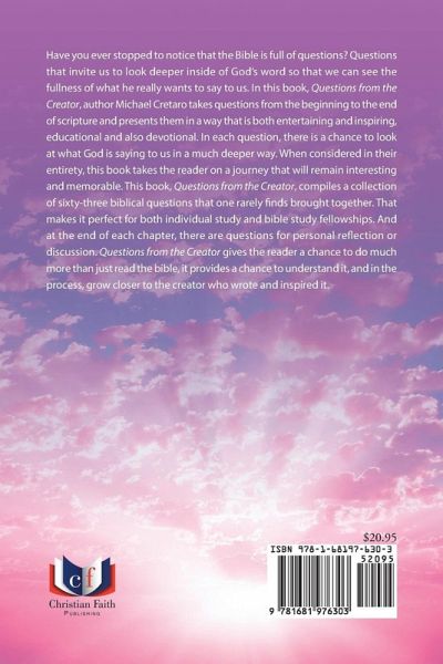 Have you ever stopped to notice that the Bible is full of questions? Questions that invite us to look deeper inside of God's word so that we can see the fullness of what he really wants to say to us. In this book, Questions from the Creator, author Michael Cretaro takes questions from the beginning to the end of scripture and presents them in a way that is both entertaining and inspiring, educational and also devotional. In each question, there is a chance to look at what God is saying to us in a much deeper way. When considered in their entirety, this book takes the reader on a journey that will remain interesting and memorable. This book, Questions from the Creator, compiles a collection of sixty biblical questions that one rarely finds brought together. That makes it perfect for both individual study and bible study fellowships. And at the end of each chapter, there are questions for personal reflection or discussion. Questions from the Creator gives the reader a chance to do much more than just read the bible, it provides a chance to understand it, and in the process, grow closer to the creator who wrote and inspired it.