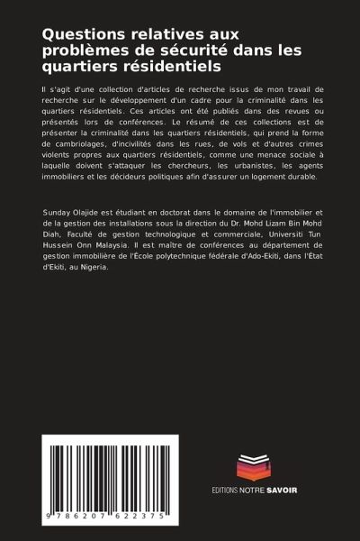 Il s'agit d'une collection d'articles de recherche issus de mon travail de recherche sur le développement d'un cadre pour la criminalité dans les quartiers résidentiels. Ces articles ont été publiés dans des revues ou présentés lors de conférences. Le résumé de ces collections est de présenter la criminalité dans les quartiers résidentiels, qui prend la forme de cambriolages, d'incivilités dans les rues, de vols et d'autres crimes violents propres aux quartiers résidentiels, comme une menace sociale à laquelle doivent s'attaquer les chercheurs, les urbanistes, les agents immobiliers et les décideurs politiques afin d'assurer un logement durable.