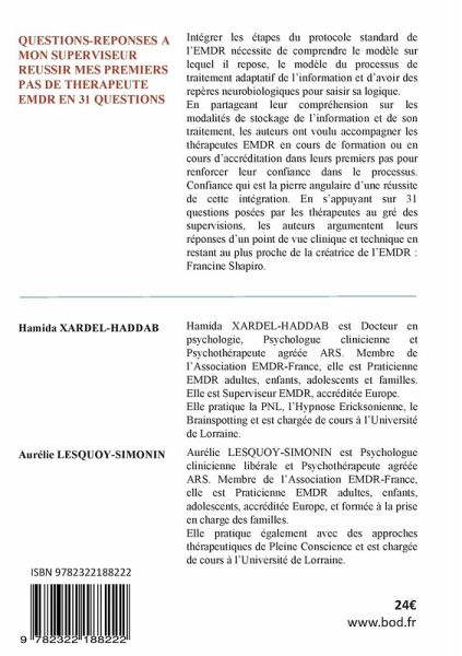 Intégrer les étapes du protocole standard de l'EMDR nécessite de comprendre le modèle sur lequel il repose, le modèle du processus de traitement adaptatif de l'information et d'avoir des repères neurobiologiques pour saisir sa logique.En partageant leur compréhension sur les modalités de stockage de l'information et de son traitement, les auteurs ont voulu accompagner les thérapeutes EMDR en cours de formation ou en cours d'accréditation dans leurs premiers pas pour renforcer leur confiance dans le processus. Confiance qui est la pierre angulaire d'une réussite de cette intégration. En s'appuyant sur 31 questions posées par les thérapeutes au gré des supervisions, les auteurs argumentent leurs réponses d'un point de vue clinique et technique en restant au plus proche de la créatrice de l'EMDR : Francine Shapiro.