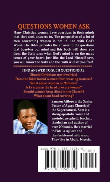 THIS BOOK PROVIDES ANSWER TO SUCH QUESTIONS AS: Should Christians use jewelries? Does the Bible forbid women from wearing trousers? What about women in Ministry? Is Everyman the head of everywoman? Should women keep silent in the Church? What about head covering?