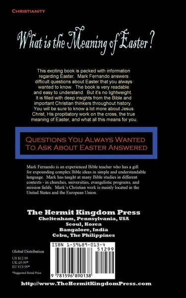 QUESTIONS YOU ALWAYS WANTED TO ASK ABOUT EASTER ANSWERED is packed with information regarding Easter. Mark Fernando answers difficult questions about Easter that you always wanted to know. The book is very readable and easy to understand. But it's no lightweight. It is filled with deep insights from the Bible and important Christian thinkers throughout history. You will be sure to know a lot more about Jesus Christ, His propitiatory work on the cross, the true meaning of Easter, and what all this means for you. Some of the questions addressed are: Did Jesus Really Rise from the Dead? Who Killed Jesus? Why Did God Have to Die to Save Humans? This book is excellent for Bible Study leaders to use as a guide or as a textbook for Sunday School classes at church or group Bible studies in the university or high school setting. As the book addresses many important issues relating to the foundation of the Christian faith, this book will prove to be very valuable for mature Christians and new Christians alike. This book aims to help Christians understand what they believe in a systematic and logical manner.