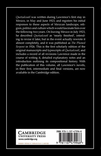 Quetzalcoatl was written during Lawrence's first stay in Mexico, in May and June 1923, and registers his initial responses to those aspects of Mexican landscape, religion, politics and culture which would fascinate him over the following two years. On leaving Mexico in July 1923, he described Quetzalcoatl as 'nearly finished', intending to revise it later, but in the event actually rewrote it almost completely, and it was published as The Plumed Serpent in 1926. This is the first scholarly edition of the original manuscripts and typescripts of Quetzalcoatl, and includes a record of all revisions Lawrence made in the course of writing it, detailed explanatory notes and an introduction outlining its compositional history. With the publication of this volume, all Lawrence's novels, in their first, intermediate and final versions, are now available in the Cambridge edition.