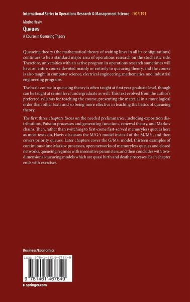 The first three chapters focus on the needed preliminaries, including exposition distributions, Poisson processes and generating functions, renewal theory, and Markov chains, Then, rather than switching to first-come first-served memoryless queues here as most texts do, Haviv discusses the M/G/1 model instead of the M/M/1, and then covers priority queues. Later chapters cover the G/M/1 model, thirteen examples of continuous-time Markov processes, open networks of memoryless queues and closed networks, queueing regimes with insensitive parameters, and then concludes with two-dimensional queueing models which are quasi birth and death processes. Each chapter ends with exercises.