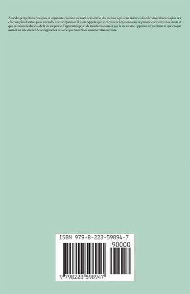 Avec des perspectives pratiques et inspirantes, l'auteur présente des outils et des exercices qui nous aident à identifier nos talents uniques et à créer un plan d'action pour atteindre une vie épanouie. Il nous rappelle que le chemin de l'épanouissement personnel est entre nos mains et que la recherche du sens de la vie est pleine d'apprentissages et de transformations et que la vie est une opportunité précieuse et que chaque instant est une chance de se rapprocher de la vie que nous ¿Nous voulons vraiment vivre.