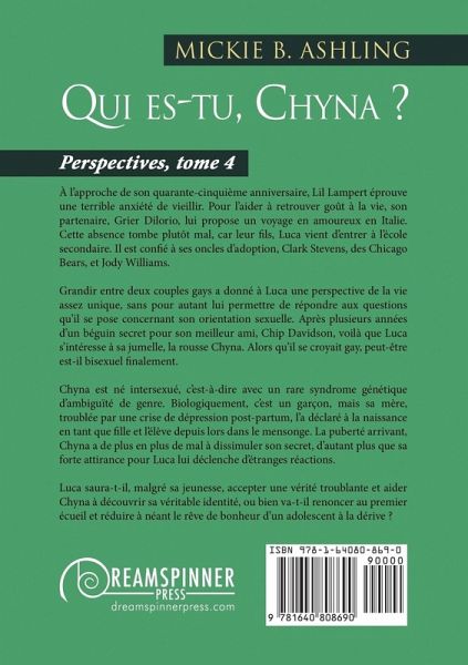 Perspectives, tome 4 À l'approche de son quarante-cinquième anniversaire, Lil Lampert éprouve une terrible anxiété de vieillir. Pour l'aider à retrouver goût à la vie, son partenaire, Grier Dilorio, lui propose un voyage en amoureux en Italie. Cette absence tombe plutôt mal, car leur fils, Luca vient d'entrer à l'école secondaire. Il est confié à ses oncles d'adoption, Clark Stevens, des Chicago Bears, et Jody Williams. Grandir entre deux couples gays a donné à Luca une perspective de la vie assez unique, sans pour autant lui permettre de répondre aux questions qu'il se pose concernant son orientation sexuelle. Après plusieurs années d'un béguin secret pour son meilleur ami, Chip Davidson, voilà que Luca s'intéresse à sa jumelle, la rousse Chyna. Alors qu'il se croyait gay, peut-être est-il bisexuel finalement. Chyna est né intersexué, c'est-à-dire avec un rare syndrome génétique d'ambiguïté de genre. Biologiquement, c'est un garçon, mais sa mère, troublée par une crise de dépression post-partum, l'a déclaré à la naissance en tant que fille et l'élève depuis lors dans le mensonge. La puberté arrivant, Chyna a de plus en plus de mal à dissimuler son secret, d'autant plus que sa forte attirance pour Luca lui déclenche d'étranges réactions. Luca saura-t-il, malgré sa jeunesse, accepter une vérité troublante et aider Chyna à découvrir sa véritable identité, ou bien va-t-il renoncer au premier écueil et réduire à néant le rêve de bonheur d'un adolescent à la dérive ?