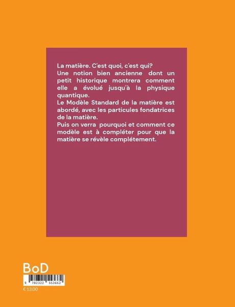 La matière. C'est quoi, c'est qui? Une notion bien ancienne dont un petit historique montrera comment elle a évolué jusqu'à la physique quantique. Le Modèle Standard de la matière est abordé, avec les particules fondatrices de la matière. Puis on verra pourquoi et comment ce modèle est à compléter pour que la matière se révèle complétement.