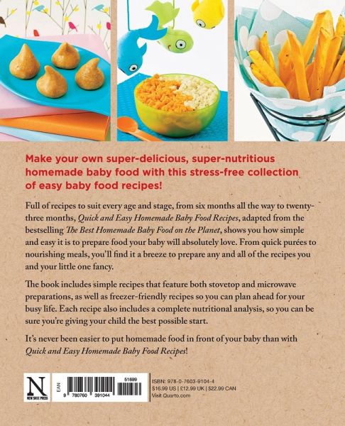 Make your own super-delicious, super-nutritious homemade baby food with this stress-free collection of easy baby food recipes. Full of recipes to suit every age and stage, from six months all the way to twenty-three months, Quick and Easy Homemade Baby Food Recipes shows you how simple and easy it is to prepare food your baby will go absolutely ga-ga for. From quick purées to nourishing meals, you’ll find it a breeze to prepare any and all of the recipes you and your little one fancy. The book includes recipes that feature both stovetop and microwave preparations, as well as freezer-friendly recipes so you can plan ahead. Each recipe also includes a complete nutritional analysis, so you can be sure you’re giving your child the best possible start. Organized by age in months, the recipes include: * Mighty Mouthful Rice Cereal * Baby’s First Oatmeal * Yummy Apple-Pear Puree * More Green Peas Puree, Please! * Peach and Banana Whip * Comfy and Cozy Rice and Apricot Pudding * Good Golly Green Beans with Carrot and Apple * Baby’s First Chicken with Corn and Potatoes * White Beans with Dreamy Creamy Spinach * Perfect Polenta with Cheddar * Toddler’s Sheperd’s Pie It’s never been easier to put homemade food in front of your baby than with Quick and Easy Homemade Baby Food Recipes!