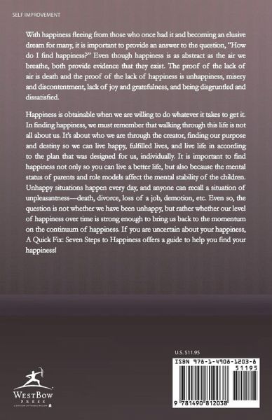 With happiness fleeing from those who once had it and becoming an elusive dream for many, it is important to provide an answer to the question, "How do I find happiness?" Even though happiness is as abstract as the air we breathe, both provide evidence that they exist. The proof of the lack of air is death and the proof of the lack of happiness is unhappiness, misery and discontentment, lack of joy and gratefulness, and being disgruntled and dissatisfied. Happiness is obtainable when we are willing to do whatever it takes to get it. In finding happiness, we must remember that walking through this life is not all about us. It's about who we are through the creator, finding our purpose and destiny so we can live happy, fulfilled lives, and live life in according to the plan that was designed for us, individually. It is important to find happiness not only so you can live a better life, but also because the mental status of parents and role models affect the mental stability of the children. Unhappy situations happen every day, and anyone can recall a situation of unpleasantness-death, divorce, loss of a job, demotion, etc. Even so, the question is not whether we have been unhappy, but rather whether our level of happiness over time is strong enough to bring us back to the momentum on the continuum of happiness. If you are uncertain about your happiness, A Quick Fix: Seven Steps to Happiness offers a guide to help you find your happiness!