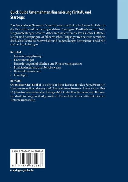 Finanzierungsplanung.- Planrechnungen.- Finanzierungsmöglichkeiten und Finanzierungspartner.- Bonitätseinstufung und Berichtswesen.- Unternehmenssteuern.- Praxistipps.