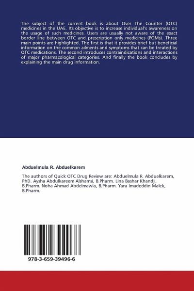 The subject of the current book is about Over The Counter (OTC) medicines in the UAE. Its objective is to increase individual s awareness on the usage of such medicines. Users are usually not aware of the exact border line between OTC and prescription only medicines (POMs). Three main points are highlighted. The first is that it provides brief but beneficial information on the common ailments and symptoms that can be treated by OTC medications. The second introduces contraindications and interactions of major pharmacological categories. And finally the book concludes by explaining the main drug information.
