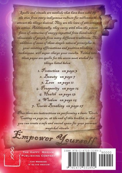 All you need to begin practicing The Craft Of The Wise TODAY.This booklet contains 20 of She`s most requested, effective, tested & true spells. (That's more that you get in most books 10 times this size) Spells and rituals are methods that have been used by the wise for millennia to attract the things desired. They are the laws of attraction in action. The addition of some of these simple natural principles to your existing affirmations and positive thinking techniques will super charge your results. Folded into these pages are spells for the seven most wished for things listed:Protection, Beauty, Love, Prosperity, Health, Wisdom, Curse Breaking,Plus there is advise, and cautions through out the book and instructions on performing a basic Circle Casting at the end of this booklet, so that you can create a safe and sacred space for your personal magickal rituals... and much more... Wow! - All of that? - YES! There is no mucking around. You can get straight into it with this little book!