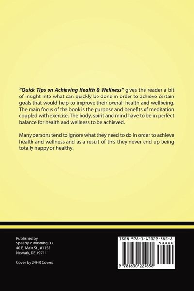 "Quick Tips on Achieving Health & Wellness" gives the reader a bit of insight into what can quickly be done in order to achieve certain goals that would help to improve their overall health and well-being. The main focus of the book is the purpose and benefits of meditation coupled with exercise. The body, spirit and mind have to be in perfect balance for health and wellness to be achieved. Many persons tend to ignore what they need to do in order to achieve health and wellness and as a result of this they never end up being totally happy or healthy.