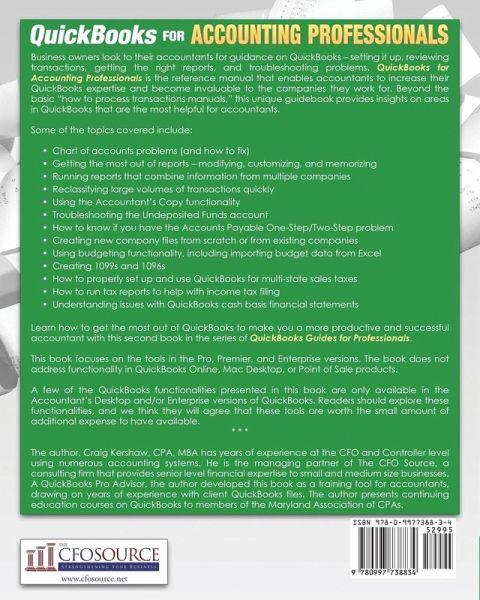 Business owners look to their accountants for guidance on QuickBooks – setting it up, reviewing transactions, getting the right reports, and troubleshooting problems. QuickBooks for Accounting Professionals is the reference manual that enables accountants to increase their QuickBooks expertise and become invaluable to the companies they work for. Beyond the basic "how to process transactions manuals," this unique guidebook provides insights on areas in QuickBooks that are the most helpful for accountants. Some of the topics covered include: Chart of accounts problems (and how to fix) Getting the most out of reports – modifying, customizing, and memorizing Running reports that combine information from multiple companies Reclassifying large volumes of transactions quickly Using the Accountant’s Copy functionality Troubleshooting the Undeposited Funds account How to know if you have the Accounts Payable One-Step/Two-Step problem Creating new company files from scratch or from existing companies Using budgeting functionality, including importing budget data from Excel Creating 1099s and 1096s How to properly set up and use QuickBooks for multi-state sales taxes How to run tax reports to help with income tax filing Understanding issues with QuickBooks cash basis financial statements Learn how to get the most out of QuickBooks to make you a more productive and successful accountant with this second book in the series of QuickBooks Guides for Professionals. This book focuses on the tools in the Pro, Premier, and Enterprise versions. The book does not address functionality in QuickBooks Online, Mac Desktop, or Point of Sale products. A few of the QuickBooks functionalities presented in this book are only available in the Accountant’s Desktop and/or Enterprise versions of QuickBooks. Readers should explore these functionalities, and we think they will agree that these tools are worth the small amount of additional expense to have available. The author, Craig Kershaw, CPA, MBA has years of experience at the CFO and Controller level using numerous accounting systems. He is the managing partner of The CFO Source, a consulting firm that provides senior level financial expertise to small and medium size businesses. A QuickBooks Pro Advisor, the author developed this book as a training tool for accountants, drawing on years of experience with client QuickBooks files. The author presents continuing education courses on QuickBooks to members of the Maryland Association of CPAs.