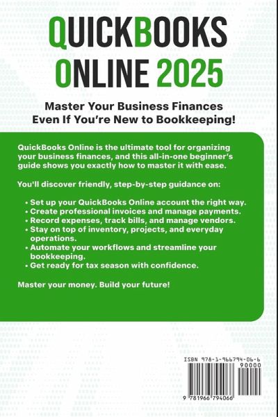 Master QuickBooks Online - The Complete Beginner's Blueprint for Confident Bookkeeping and Business Success! If you're brand new to bookkeeping or QuickBooks Online feels overwhelming, you're in exactly the right place. This beginner-focused guide is designed to walk you through every essential skill step-by-step-no confusing jargon, no accounting background needed.What Makes This Book Stand Out? ¿ Clear, Beginner-Friendly Instructions: Every chapter is written for first-time users, with simple, practical guidance to help you set up and run your QuickBooks account the right way. ¿ Helpful Visuals and Real-World Examples: Detailed screenshots and real-world scenarios make learning easy, even if you've never used bookkeeping software before. ¿ Practical Skills You'll Actually Use: Learn how to handle invoices, expenses, taxes, payroll, and reports-all focused on what small business owners, freelancers, and home-based entrepreneurs really need. ¿ Step-by-Step Setup and Best Practices: Avoid common mistakes! You'll get proven strategies for organizing your finances, saving time, and preparing for tax season stress-free.What You'll Learn:Set up QuickBooks Online easily-even if you're starting from scratch Track income, expenses, and cash flow for a clear financial picture Create and send professional invoices to your customers Pay bills, manage vendors, and stay on top of expenses Reconcile bank accounts and avoid errors before they snowball Run basic financial reports to understand your business performance Automate daily tasks to free up more of your valuable time Close your books each month and prepare for tax season confidently Whether you're managing side gigs, launching your first business, or just trying to get organized-this book speaks your language and meets you where you are.