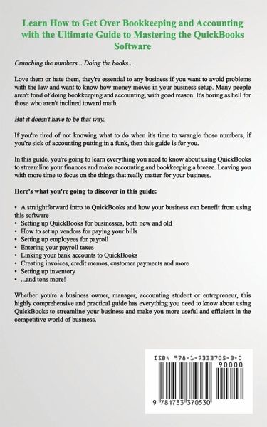 Learn How to Get Over Bookkeeping and Accounting with the Ultimate Guide to Mastering the QuickBooks Software Crunching the numbers... Doing the books... Love them or hate them, they're essential to any business if you want to avoid problems with the law and want to know how money moves in your business setup. Many people aren't fond of doing bookkeeping and accounting, with good reason. It's boring as hell for those who aren't inclined toward math. But it doesn't have to be that way. If you're tired of not knowing what to do when it's time to wrangle those numbers, if you're sick of accounting putting in a funk, then this guide is for you. In this guide, you're going to learn everything you need to know about using QuickBooks to streamline your finances and make accounting and bookkeeping a breeze. Leaving you more time to focus on the things that really matter for your business. Here's what you're going to discover in this guide: * A straightforward intro to QuickBooks and how your business can benefit from using this software * Setting up QuickBooks for businesses, both new and old * How to set up vendors for paying your bills * Setting up employees for payroll * Entering your payroll taxes * Linking your bank accounts to QuickBooks * Creating invoices, credit memos, customer payments and more * Setting up inventory * ...and tons more! Whether you're a business owner, manager, accounting student or entrepreneur, this highly comprehensive and practical guide has everything you need to know about using QuickBooks to streamline your business and make you more useful and efficient in the competitive world of business. Scroll up and click the "add to cart" button to buy now!