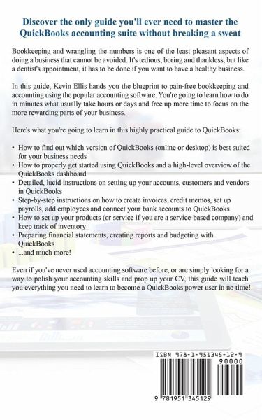 Discover the only guide you'll ever need to master the QuickBooks accounting suite without breaking a sweat Bookkeeping and wrangling the numbers is one of the least pleasant aspects of doing a business that cannot be avoided. It's tedious, boring and thankless, but like a dentist's appointment, it has to be done if you want to have a healthy business. In this guide, Kevin Ellis hands you the blueprint to pain-free bookkeeping and accounting using the popular accounting software. You're going to learn how to do in minutes what usually take hours or days and free up more time to focus on the more rewarding parts of your business. Here's what you're going to learn in this highly practical guide to QuickBooks: * How to find out which version of QuickBooks (online or desktop) is best suited for your business needs * How to properly get started using QuickBooks and a high-level overview of the QuickBooks dashboard * Detailed, lucid instructions on setting up your accounts, customers and vendors in QuickBooks * Step-by-step instructions on how to create invoices, credit memos, set up payrolls, add employees and connect your bank accounts to QuickBooks * How to set up your products (or service if you are a service-based company) and keep track of inventory * Preparing financial statements, creating reports and budgeting with QuickBooks * ...and much more! Even if you've never used accounting software before, or are simply looking for a way to polish your accounting skills and prop up your CV, this guide will teach you everything you need to learn to become a QuickBooks power user in no time! Scroll up and click the "add to cart" to buy now!