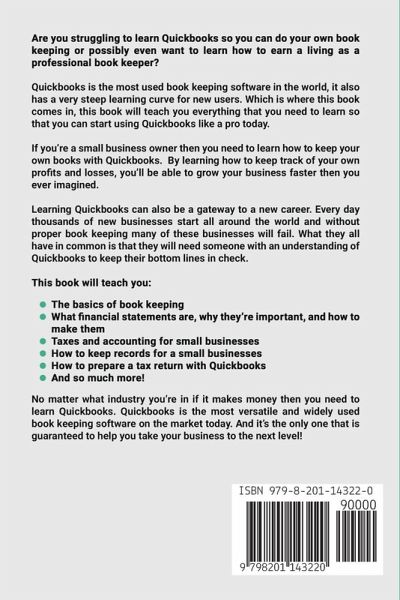 Are you struggling to learn Quickbooks so you can do your own book keeping or possibly even want to learn how to earn a living as a professional book keeper? Quickbooks is the most used book keeping software in the world, it also has a very steep learning curve for new users. Which is where this book comes in, this book will teach you everything that you need to learn so that you can start using Quickbooks like a pro today. If you're a small business owner then you need to learn how to keep your own books with Quickbooks. By learning how to keep track of your own profits and losses, you'll be able to grow your business faster then you ever imagined. Learning Quickbooks can also be a gateway to a new career. Every day thousands of new businesses start all around the world and without proper book keeping many of these businesses will fail. What they all have in common is that they will need someone with an understanding of Quickbooks to keep their bottom lines in check. This book will teach you: - The basics of book keeping - What financial statements are, why they're important, and how to make them - Taxes and accounting for small businesses - How to keep records for a small businesses - How to prepare a tax return with Quickbooks And so much more! No matter what industry you're in if it makes money then you need to learn Quickbooks. Quickbooks is the most versatile and widely used book keeping software on the market today. And it's the only one that is guaranteed to help you take your business to the next level. If you are serious about learning Quickbooks then you need to get this book today!