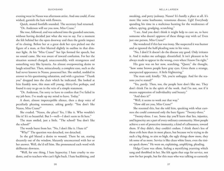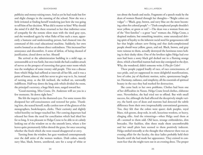 The orphan of a Danish mother and a West Indian father, Helga Crane is a young woman caught between cultures and in search of a home. Though her beauty and education open many doors, as a biracial woman in 1920s America, Helga is accepted by neither the Black nor the white communities—instead remaining an object of curiosity and an outsider wherever she goes. Her furious quest for belonging will take her from Chicago to New York to Denmark: a journey rife with autobiographical parallels to Larsen’s own life. With its astonishingly contemporary take on identity and an angry, rebellious heroine, Quicksand is a classic novel ripe for rediscovery.