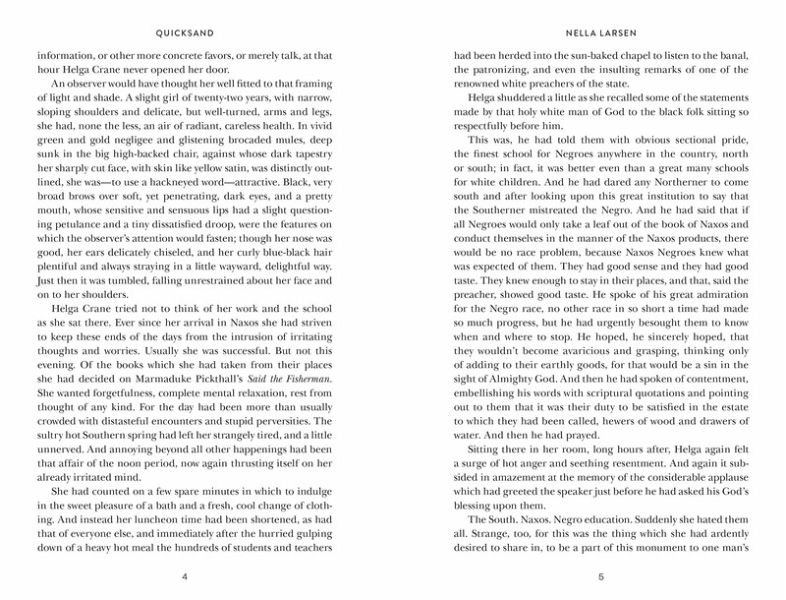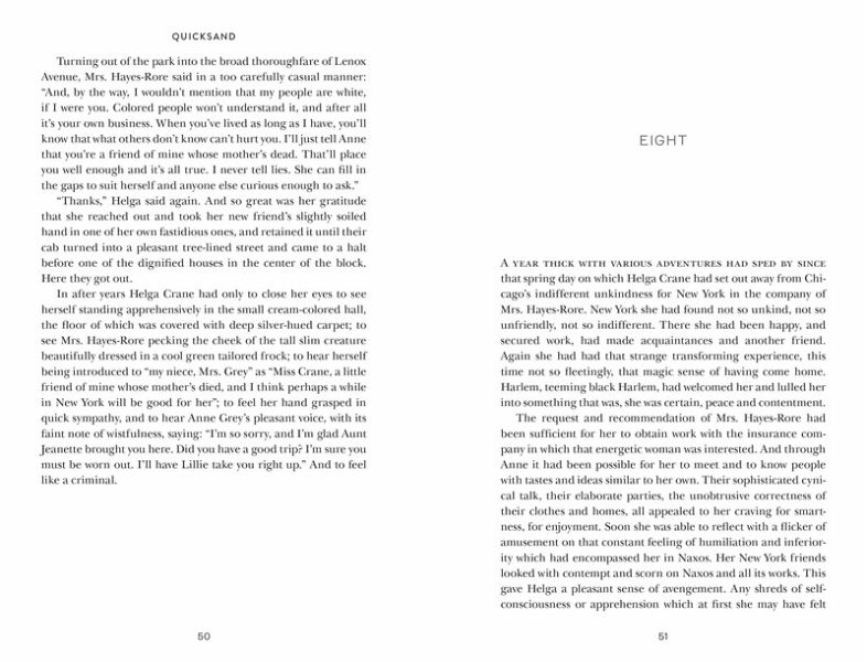 The orphan of a Danish mother and a West Indian father, Helga Crane is a young woman caught between cultures and in search of a home. Though her beauty and education open many doors, as a biracial woman in 1920s America, Helga is accepted by neither the Black nor the white communities—instead remaining an object of curiosity and an outsider wherever she goes. Her furious quest for belonging will take her from Chicago to New York to Denmark: a journey rife with autobiographical parallels to Larsen’s own life. With its astonishingly contemporary take on identity and an angry, rebellious heroine, Quicksand is a classic novel ripe for rediscovery.