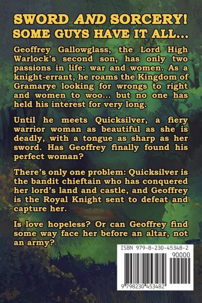 SWORDS AND SORCERY! SOME GUYS HAVE IT ALL... Geoffrey Gallowglass, the Lord High Warlock's second son, has only two passions in life: war and women. As a knight-errant, he roams the Kingdom of Gramarye looking for wrongs to right and women to woo... but no one has held his interest for very long. Until he meets Quicksilver, a fiery warrior woman as beautiful as she is deadly, with a tongue as sharp as her sword. Has Geoffrey finally found his perfect woman? There's only one problem: Quicksilver is the bandit chieftain who has conquered her lord's land and castle, and Geoffrey is the Royal Knight sent to defeat and capture her. Is love hopeless? Or can Geoffrey find some way face her before an altar, not an army?
