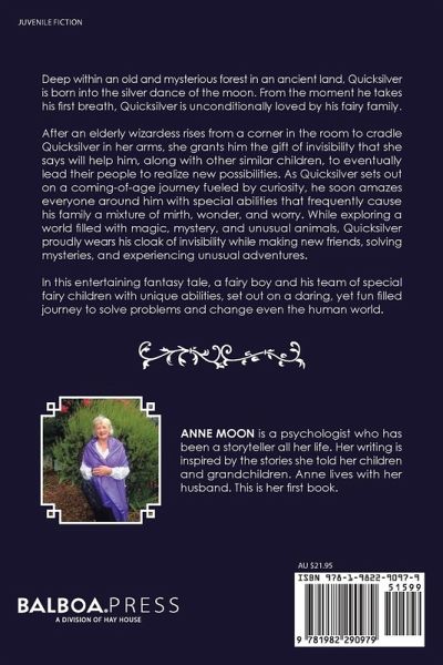 Deep within an old and mysterious forest in an ancient land, Quicksilver is born into the silver dance of the moon. From the moment he takes his first breath, Quicksilver is unconditionally loved by his fairy family. After an elderly wizardess rises from a corner in the room to cradle Quicksilver in her arms, she grants him the gift of invisibility that she says will help him, along with other similar children, to eventually lead their people to realize new possibilities. As Quicksilver sets out on a coming-of-age journey fueled by curiosity, he soon amazes everyone around him with special abilities that frequently cause his family a mixture of mirth, wonder, and worry. While exploring a world filled with magic, mystery, and unusual animals, Quicksilver proudly wears his cloak of invisibility while making new friends, solving mysteries, and experiencing unusual adventures. In this entertaining fantasy tale, a fairy boy and his team of special fairy children with unique abilities, set out on a daring, yet fun filled journey to solve problems and change even the human world