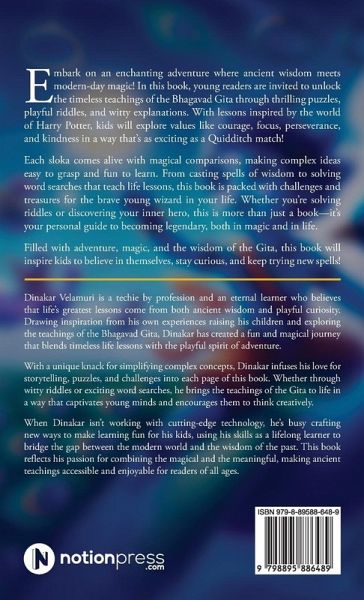 Embark on an enchanting adventure where ancient wisdom meets modern-day magic! In this book, young readers are invited to unlock the timeless teachings of the Bhagavad Gita through thrilling puzzles, playful riddles, and witty explanations. With lessons inspired by the world of Harry Potter, kids will explore values like courage, focus, perseverance, and kindness in a way that's as exciting as a Quidditch match! Each sloka comes alive with magical comparisons, making complex ideas easy to grasp and fun to learn. From casting spells of wisdom to solving word searches that teach life lessons, this book is packed with challenges and treasures for the brave young wizard in your life. Whether you're solving riddles or discovering your inner hero, this is more than just a book-it's your personal guide to becoming legendary, both in magic and in life. Filled with adventure, magic, and the wisdom of the Gita, this book will inspire kids to believe in themselves, stay curious, and keep trying new spells!