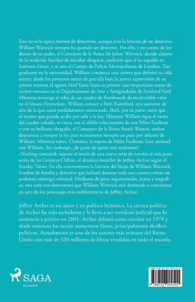 Esta no es la típica historia de detectives, aunque sí es la historia de un detective. William Warwick siempre ha querido ser detective. Por ello, y en contra de los deseos de su padre, el Consejero de la Reina Sir Julian Warwick, decide alejarse de la tradición familiar de estudiar abogacía, tradición que sí ha seguido su hermana Grace, y se une al Cuerpo de Policía Metropolitana de Londres. Tras graduarse en la universidad, William comienza una carrera que definirá su vida entera: desde los primeros meses de patrulla bajo la atenta supervisión de su primer mentor, el agente Fred Yates; hasta su primer caso importante como detective veterano en el Departamento de Arte y Antigüedades de Scotland Yard. Mientras investiga el robo de un cuadro de Rembrandt de incalculable valor en el Museo Fitzmolean, William conoce a Beth Rainsford, una asistente de arte de la que caerá perdidamente enamorado. Beth, por su parte, teme que el secreto que guarda acaba por salir a la luz. Mientras William sigue el rastro del cuadro robado, se cruza con el afable coleccionista de arte Miles Faulkner y con su brillante abogado, el Consejero de la Reina Booth Watson, ambos dispuestos a romper la ley para mantenerse siempre un paso por delante de William. Mientras tanto, Christina, la esposa de Miles Faulkner, hace amistad con William. Sin embargo, ¿de parte de quién está realmente? «Nothing ventured» supone el inicio de una nueva serie de novelas al más puro estilo de las Crónicas Clifton, el absoluto besteller de Jeffrey Archer según el Sunday Times. En ella conoceremos la historia del linaje de William Warwick, hombre de familia y detective que luchará durante toda una carrera contra un poderoso enemigo criminal. Mediante de giros argumentales, éxitos y tragedias, esta serie nos demostrará que William Warwick está destinado a convertirse en uno de los personajes más emblemáticos de Jeffrey Archer. -