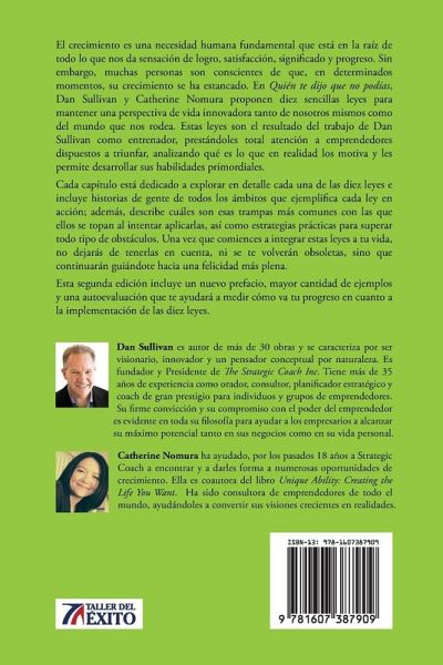 El crecimiento es una necesidad humana fundamental que está en la raíz de todo lo que nos da sensación de logro, satisfacción, significado y progreso. Sin embargo, muchas personas son conscientes de que, en determinados momentos, su crecimiento se ha estancado. En Quién te dijo que no podías, Dan Sullivan y Catherine Nomura proponen diez sencillas leyes para mantener una perspectiva de vida innovadora tanto de nosotros mismos como del mundo que nos rodea. Estas leyes son el resultado del trabajo de Dan Sullivan como entrenador, prestándoles total atención a emprendedores dispuestos a triunfar, analizando qué es lo que en realidad los motiva y les permite desarrollar sus habilidades primordiales. Cada capítulo está dedicado a explorar en detalle cada una de las diez leyes e incluye historias de gente de todos los ámbitos que ejemplifica cada ley en acción; además, describe cuáles son esas trampas más comunes con las que ellos se topan al intentar aplicarlas, así como estrategias prácticas para superar todo tipo de obstáculos. Una vez que comiences a integrar estas leyes a tu vida, no dejarás de tenerlas en cuenta, ni se te volverán obsoletas, sino que continuarán guiándote hacia una felicidad más plena. Esta segunda edición incluye un nuevo prefacio, mayor cantidad de ejemplos y una autoevaluación que te ayudará a medir cómo va tu progreso en cuanto a la implementación de las diez leyes.