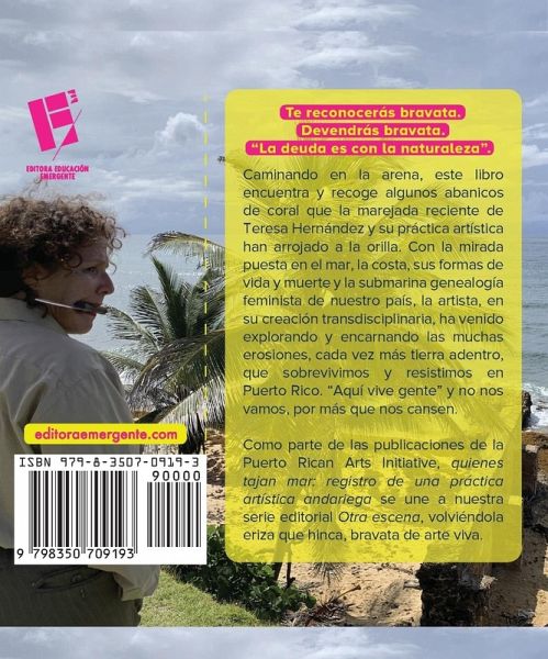 Te reconocerás bravata. Devendrás bravata. "La deuda es con la naturaleza". Caminando en la arena, este libro encuentra y recoge algunos abanicos de coral que la marejada reciente de Teresa Hernández y su práctica artística han arrojado a la orilla. Con la mirada puesta en el mar, la costa, sus formas de vida y muerte y la submarina genealogía feminista de nuestro país, la artista, en su creación transdisciplinaria, ha venido explorando y encarnando las muchas erosiones, cada vez más tierra adentro, que sobrevivimos y resistimos en Puerto Rico. "Aquí vive gente" y no nos vamos, por más que nos cansen. Como parte de las publicaciones de la Puerto Rican Arts Initiative, quienes tajan mar: registro de una práctica artística andariega se une a nuestra serie editorial Otra escena, volviéndola eriza que hinca, bravata de arte viva.