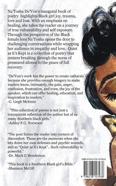 ¿¿ Na'Tosha De'Von's inaugural book of poetry highlights Black girl joy, trauma, love and loss. With an emphasis on healing, she takes the reader on a journey of true vulnerability and self exposure. Through the perspective of the Black female lens Na'Tosha opens the door to challenging conversations while wrapping her audience in empathy and love. Quiet as it's Kept is a collection of poetry that centers breaking through the norm of pressured silence to the peace of full recovery.