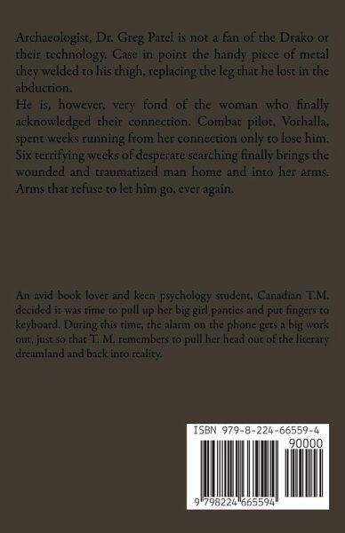 Archaeologist, Dr. Greg Patel is not a fan of the Drako or their technology. Case in point the handy piece of metal they welded to his thigh, replacing the leg that he lost in the abduction. He is, however, very fond of the woman who finally acknowledged their connection. Combat pilot, Vorhalla, spent weeks running from her connection only to lose him. Six terrifying weeks of desperate searching finally brings the wounded and traumatized man home and into her arms. Arms that refuse to let him go, ever again.