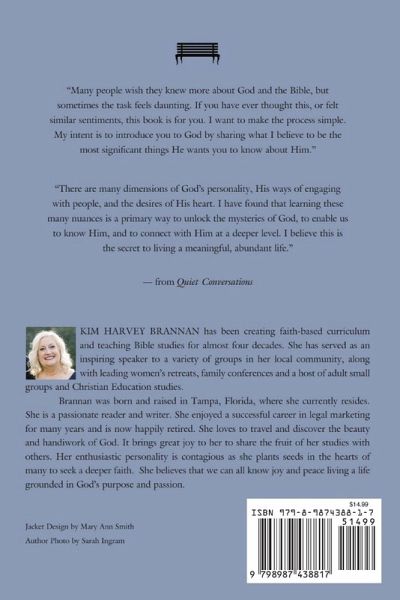 When we take an intentional, much-needed break from our busy schedules, our hearts and spirits become open to ponder the meaning and purpose of life. Kim Harvey Brannan's recently released book, Quiet Conversations, is an invitation to do just that. Are you curious about God and His role in your life? Do you wonder how you can know more about Him and experience His presence? Does knowing God make a difference in how you choose to experience life? If so, Quiet Conversations is the book for you. The undertaking of spiritual discovery can sometimes feel daunting. In her debut book, Brannan streamlines the process and simplifies the approach by sharing the essentials. She provides the most compelling facets that she fervently believes God himself wants you to know about Him. Glimpse into God's mindset as you see His thoughts and feelings revealed through the Bible. Delve into Quiet Conversations and enrich your faith. Discover a higher and more meaningful way to live. Brannan's new book will inspire individuals personally as they explore their own faith. In addition, Quiet Conversations will provide an opportunity for engaging interaction in a small-group Bible study experience. Reflection questions follow each chapter, providing an easy format for sharing in the journey among friends.