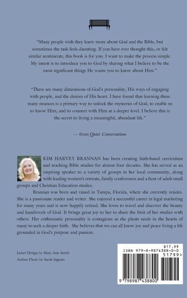 When we take an intentional, much-needed break from our busy schedules, our hearts and spirits become open to ponder the meaning and purpose of life. Kim Harvey Brannan's recently released book, Quiet Conversations, is an invitation to do just that. Are you curious about God and His role in your life? Do you wonder how you can know more about Him and experience His presence? Does knowing God make a difference in how you choose to experience life? If so, Quiet Conversations is the book for you. The undertaking of spiritual discovery can sometimes feel daunting. In her debut book, Brannan streamlines the process and simplifies the approach by sharing the essentials. She provides the most compelling facets that she fervently believes God himself wants you to know about Him. Glimpse into God's mindset as you see His thoughts and feelings revealed through the Bible. Delve into Quiet Conversations and enrich your faith. Discover a higher and more meaningful way to live. Brannan's new book will inspire individuals personally as they explore their own faith. In addition, Quiet Conversations will provide an opportunity for engaging interaction in a small-group Bible study experience. Reflection questions follow each chapter, providing an easy format for sharing in the journey among friends.