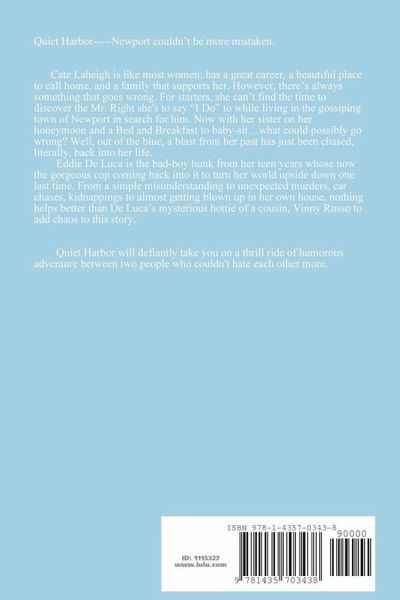 Cate Laheigh is like most women; has a great career, a beautiful place to call home, and a family that supports her. However, there's always something that goes wrong.Now with her sister on her honeymoon and a Bed and Breakfast to baby-sit...what could possibly go wrong? Well, out of the blue, a blast from her past has just been chased, literally, back into her life. Eddie De Luca is the bad-boy from her teen years whose now the gorgeous cop coming back into it to turn her world upside down one last time. From a simple misunderstanding to unexpected murders, car chases, kidnappings to almost getting blown up in her own house, nothing helps better than De Luca's mysterious hottie of a cousin, Vinny Russo to add even more chaos. Quiet Harbor will defiantly take you on a thrill ride of humorous adventure between two people who couldn't hate each other more.