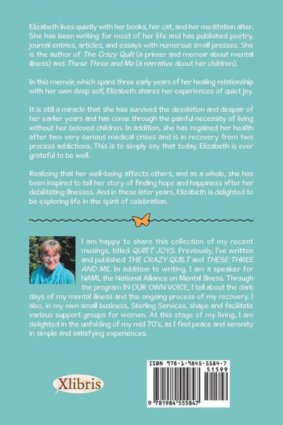Elizabeth lives quietly with her books, her cat, and her meditation alter. She has been writing for most of her life and has published poetry, journal entries, articles, and essays with numerous small presses. She is the author of The Crazy Quilt (a primer and memoir about mental illness) and These Three and Me (a narrative about her children). In this memoir, which spans three early years of her healing relationship with her own deep self, Elizabeth shares her experiences of quiet joy. It is still a miracle that she has survived the desolation and despair of her earlier years and has come through the painful necessity of living without her beloved children. In addition, she has regained her health after two very serious medical crises and is in recovery from two process addictions. This is to simply say that today, Elizabeth is ever grateful to be well. Realizing that her well-being affects others, and as a whole, she has been inspired to tell her story of finding hope and happiness after her debilitating illnesses. And in these later years, Elizabeth is delighted to be exploring life in the spirit of celebration.