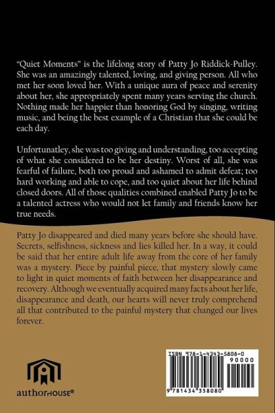 "Quiet Moments" is the lifelong story of Patty Jo Riddick-Pulley. She was an amazingly talented, loving, and giving person. All who met her soon loved her. With a unique aura of peace and serenity about her, she appropriately spent many years serving the church. Nothing made her happier than honoring God by singing, writing music, and being the best example of a Christian that she could be each day. Unfortunatley, she was too giving and understanding, too accepting of what she considered to be her destiny. Worst of all, she was fearful of failure, both too proud and ashamed to admit defeat; too hard working and able to cope, and too quiet about her life behind closed doors. All of those qualities combined enabled Patty Jo to be a talented actress who would not let famiily and friends know her true needs. Patty Jo disappeared and died many years before she should have. Secrets, selfishness, sickness and lies killed her. In a way, it could be said that her entire adult life away from the core of her family was a mystery. Piece by painful piece, that mystery slowly came to light in quiet moments of faith between her disappearance and recovery. Although we eventually acquired many facts about her life, disappearance and death, our hearts will never truly comprehend all that contributed to the painful mystery that changed our lives forever.