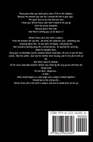 "Every place when you think you're alone, I'll be in the shadows... Because the moment you saw me, I noticed the look in your eyes... The spark that no one else had ever seen. I know you, Winter Evans, and I don't intend to let you go. Don't be afraid, Snowflake, Because you're mine now. And there's nothing you can do about it." Winter Evans fell in love with a vampire... From the moment she saw him... she knew she sealed her fate... Something was confusing about him... he was dark, terrifying... and purely evil. But instead of backing away like a normal person... he sparked her curiosity. When he shouldn't have. Every year, on November fourth, someone Winter loved died... At first it was her best friend... then her father... but now her mother went missing, and it's her job to look for her. But that's when he showed. At her most vulnerable moment, Winter was taken by the very person she knew she should avoid. He was dark... dangerous. A killer. What would happen if a snow angel and a vampire clashed together? Stained lips on her frosty skin. Winter Evans fell in love with a vampire, and now he would never let her go.