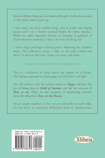 Quiet Observations Summary: This book is made up of verses about the simple act of being. You know, the moments when you are quietly reading between the lines of encounters in everyday life. How deep these waters run. I felt compelled to write these feelings in rhyme after my mother's death. I am the fourth daughter in a family of five girls. We are as different as five sisters can be. For years I did not understand how we could be so different. We did in fact; grow up in the same household exposed to the same teachings (except for the eldest). One evening shortly after my mother's funeral, I was fascinated talking to my sister Deborah about one past experience, the painful time of our parents break-up. I could not believe how we could view the same series of events and interpret them completely different. I did not see her view as wrong. There were many things she expressed that had never crossed my mind. There was great disharmony among the five of us regarding the finalization of my mother's affairs. It was much like the impact of an earthquake that changed the landscape of our relationships forever. Once your view changes, everything shifts. I began to notice more and more how each of us see life through our own filter. This filter or viewpoint seems to be made up of in-born tendencies of personality and emotion mixed with socialization. When you add it all together it equals our expectation of the world around us. This filter can cause us to see things in others that are not there or not see character traits that are there. I am an avid lover of art, music etc. I have no formal training in sociology. These writing are by no means a perfect view of anything except the view from me. I want to see how many people relate to the words on these pages. I have come to the conclusion that I am happy, sad, angry etc. because of my expectations, internal make up and beliefs, not because of other people or the world around me. The first poem I wrote was Puppy which reflects the sadness of the loss of my Mom. I come to view all events in my life in a new way. Many of the things I've perceived as painful were neither good nor bad. They were however, necessary for the birth of a new outlook. It is a blessing that I did not get some of the things I have wanted looking back over my life. Real rebirth has a period of hard labor, just as any birth would. If our lives are to be satisfying, we must go through many of these periods of hard labor repeatedly so we continue to sidestep stagnation throughout our lives. These views are reflected in Savor the sound, Torn, Turns, Expectations and others There is also the lighter side of life written as Child of summer, Seven Minutes from Me, Dear to Me and the poem in the book that is really close to my heart, Miles, expressing my feelings regarding my darling nephew by the same name. I have attempted to include poems from many angles. This little book of thoughts and rhymes gives the reader a chance to add your personal quiet observations in the back. I hope you come to treasure what you've added in your copy. Lastly, I realize all the things that make me different from my sisters, yet there is a long list of things we share. I apply this to my feelings toward our larger human family. We are like brothers and sisters. At times we are at odds in our viewpoint, yet always deeply connected at our core. Peace Always, Beverly