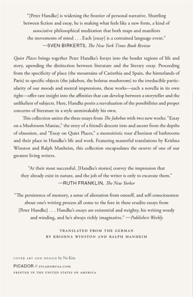 A career-spanning collection of essays by the Nobel laureate Peter Handke, featuring two new works never before published in English Quiet Places brings together Peter Handke's forays into the border regions of life and story, upending the distinction between literature and the literary essay. Proceeding from the specificity of place (the mountains of Carinthia and Spain, the hinterlands of Paris) to specific objects (the jukebox, the boletus mushroom) to the irreducible particularity of our moods and mental impressions, these works-each a novella in its own right-offer rare insight into the affinities that can develop between a storyteller and the unlikeliest of subjects. Here, Handke posits a reevaluation of the possibilities and proper concerns of literature in a style unmistakably his own. This collection unites the three essays from The Jukebox with two new works: "Essay on a Mushroom Maniac," the story of a friend's descent into and ascent from the depths of obsession, and "Essay on Quiet Places," a memoiristic tour d'horizon of bathrooms and their place in Handke's life and work. Featuring masterful translations by Krishna Winston and Ralph Manheim, this collection encapsulates the oeuvre of one of our greatest living writers.