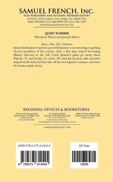 Farce Marrijane Hayes and Joseph Hayes Characters: 8 male, 10 female Interior Set James Clark plans to spend a peaceful summer concentrating on getting elected president of his country club, a first step toward becoming District Attorney in the fall. Uncle Jimmie's plans go astray when Pamela, 17, and Sonny, 15, arrive. He wins his election with inventive help from the kids, but they also all but wreck James' romance and turn the house upside down.
