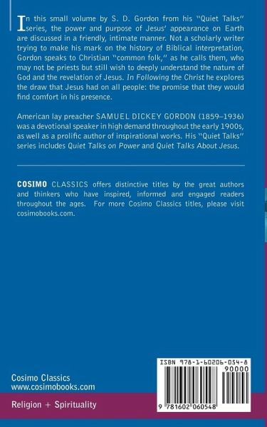 In this small volume by S. D. Gordon from his "Quiet Talks" series, the power and purpose of Jesus' appearance on Earth are discussed in a friendly, intimate manner. Not a scholarly writer trying to make his mark on the history of Biblical interpretation, Gordon speaks to Christian "common folk," as he calls them, who may not be priests but still wish to deeply understand the nature of God and the revelation of Jesus. In Following the Christ he explores the draw that Jesus had on all people: the promise that they would find comfort in his presence. American lay preacher SAMUEL DICKEY GORDON (1859-1936) was a devotional speaker in high demand throughout the early 1900s, as well as a prolific author of inspirational works. His "Quiet Talks" series includes Quiet Talks on Power and Quiet Talks About Jesus.
