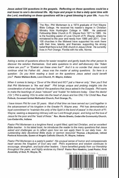 Jesus asked 324 questions in the gospels. Reflecting on these questions could be a real boost to one's devotional life. My hope and prayer is that a daily quiet time with the Lord, meditating on these questions will be a great blessing in your life. Pastor Phil