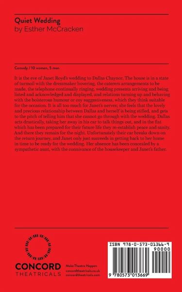 It is the eve of Janet Royd's wedding to Dallas Chaynor. The house is in a state of turmoil with the dressmaker hovering, the caterers arrangements to be made, the telephone continually ringing, wedding presents arriving and being listed and acknowledged and displayed, and relations turning up and behaving with the boisterous humour or coy suggestiveness, which they think suitable for the occasion. It is all too much for Janet's nerves; she feels that the lovely and precious relationship between Dallas and herself is being stifled, and gets to the pitch of telling him that she cannot go through with the wedding. Dallas acts drastically, taking her away in his car to talk things out, and in the flat which has been prepared for their future life they re-establish peace and sanity. And there they remain for the night. Unfortunately their car breaks down on the return journey, and Janet only just succeeds in getting back to her home in time to be ready for the wedding. Her absence has been concealed by a sympathetic aunt, with the connivance of the housekeeper and Janet's father.