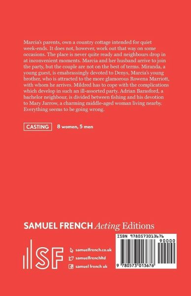 Marcia's parents, own a country cottage intended for quiet week-ends. It does not, however, work out that way on some occasions. The place is never quite ready and neighbours drop in at inconvenient moments. Marcia and her husband arrive to join the party, but the couple are not on the best of terms. Miranda, a young guest, is emabrassingly devoted to Denys, Marcia's young brother, who is attracted to the more glamorous Rowena Marriott, with whom he arrives. Mildred has to cope with the complications which develop in such an ill-assorted party. Adrian Barasford, a bachelor neighbour, is divided between fishing and his devotion to Mary Jarrow, a charming middle-aged woman living nearby. Everything seems to be going wrong.- 8 women, 5 men